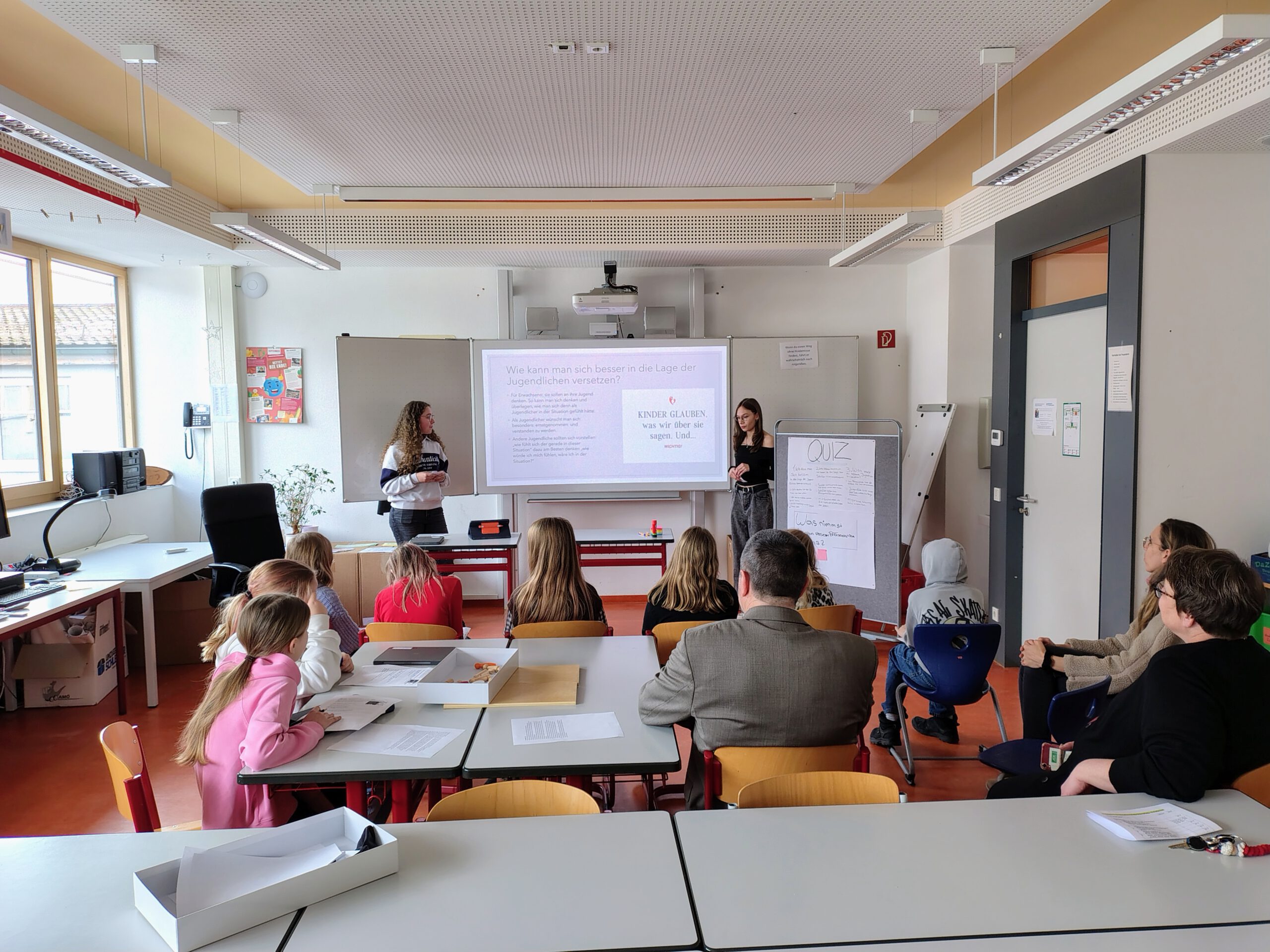 In einer Arbeitsphase teilte sich die Klasse in vier Gruppen auf. Eine davon entwickelte einen sogenannten „Notfallkoffer“ – Ideen und Strategien für Momente, in denen es einem psychisch nicht gut geht. Mit viel Engagement sammelten die Schülerinnen und Schüler Vorschläge, die Nähe, Bewegung und Selbstfürsorge in den Mittelpunkt stellten: Sport treiben, schlafen, Zeit mit Haustieren verbringen. Es wurde spürbar, wie ernsthaft sich die Jugendlichen mit der Frage beschäftigten, was wirklich helfen kann.